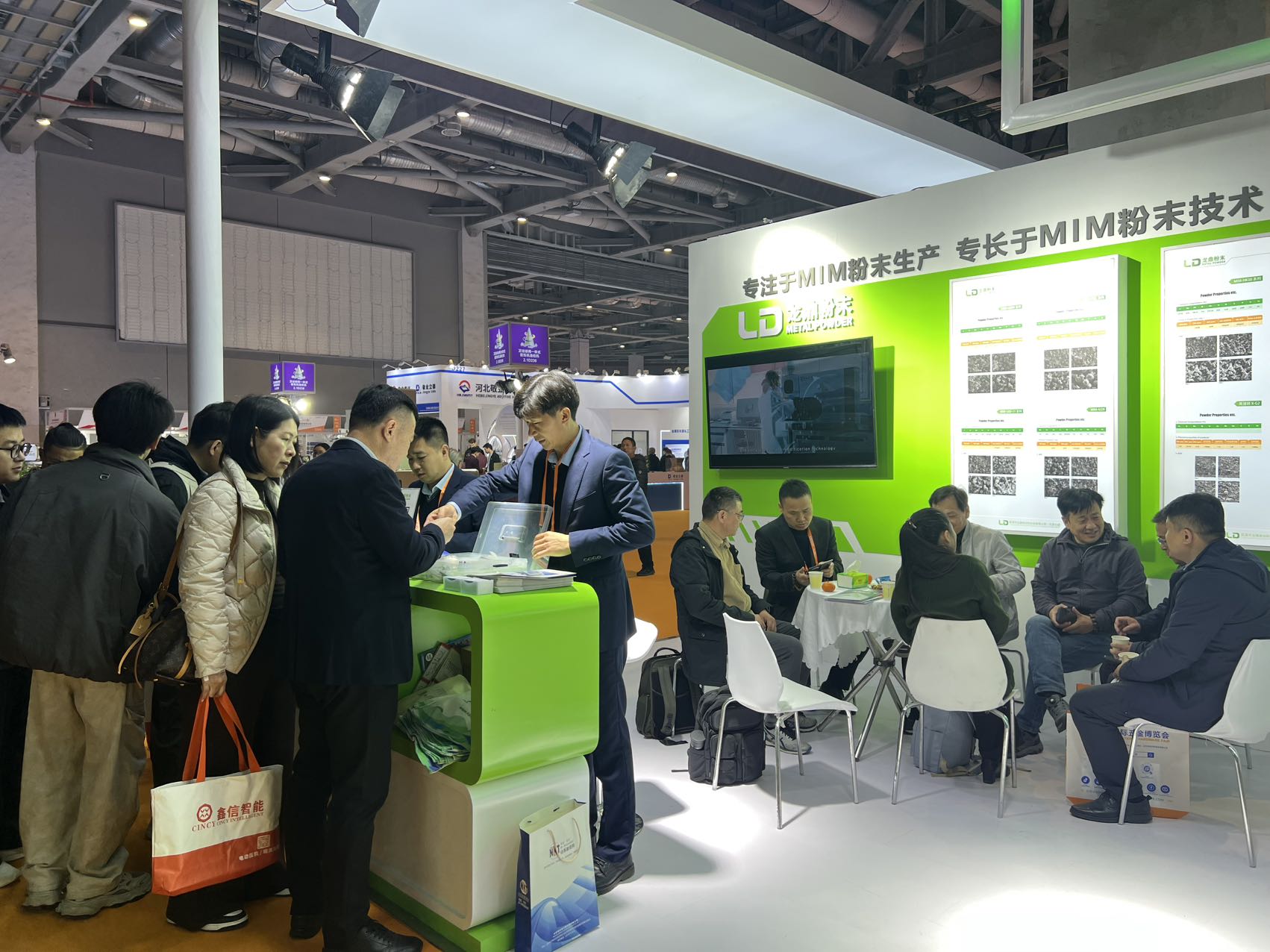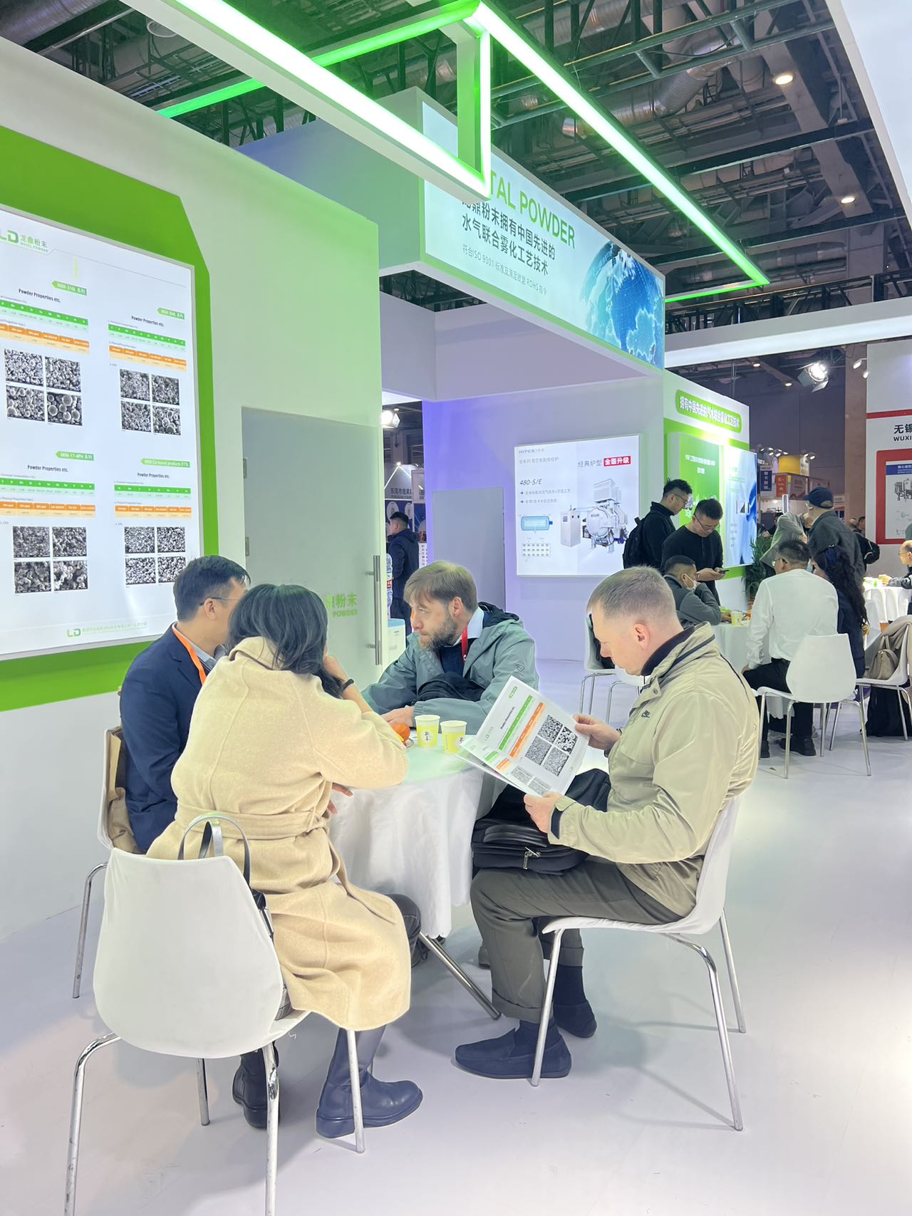 展位內(nèi)設(shè)置了多輪商務(wù)洽談環(huán)節(jié),客戶與技術(shù)團(tuán)隊(duì)圍坐交流,圍繞 MIM 粉末的選型、工藝優(yōu)化、量產(chǎn)適配等核心問題展開深入探討,現(xiàn)場合作意向滿滿。